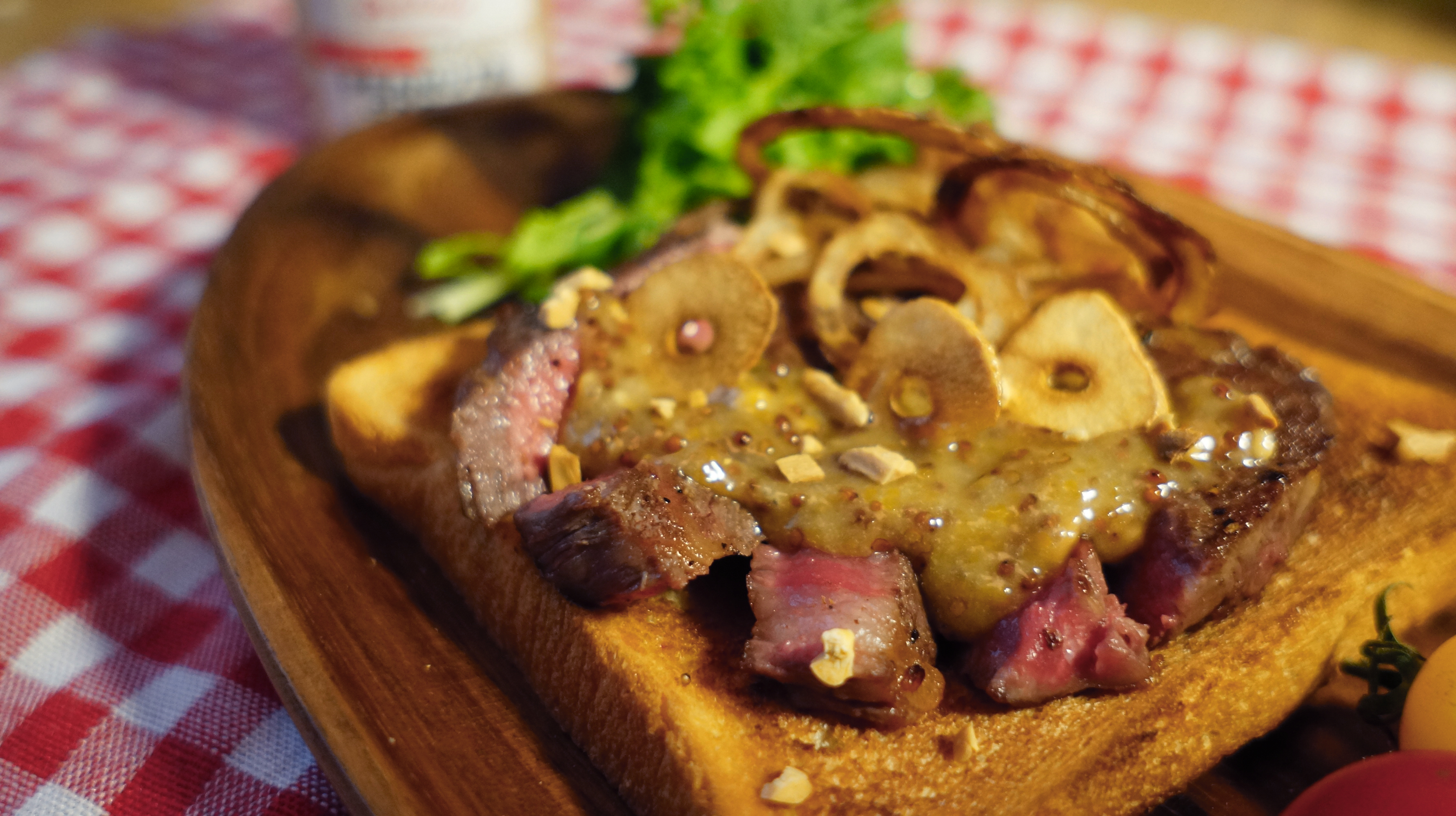 グリルチーズトーストにピーナッツクリームキナコの組み合わせ。バルサミコ酢との相性も良く、アルコールにも合う大人の味わい。