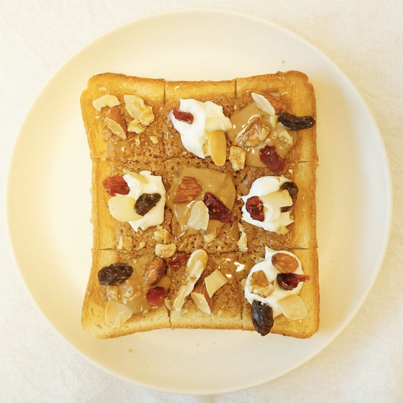 1. 食パンにピーナッツクリームの半分量を塗り、縦横3等分に下まで切れない様に切り目を入れトーストする(急に焦げ始めるので注意が必要)