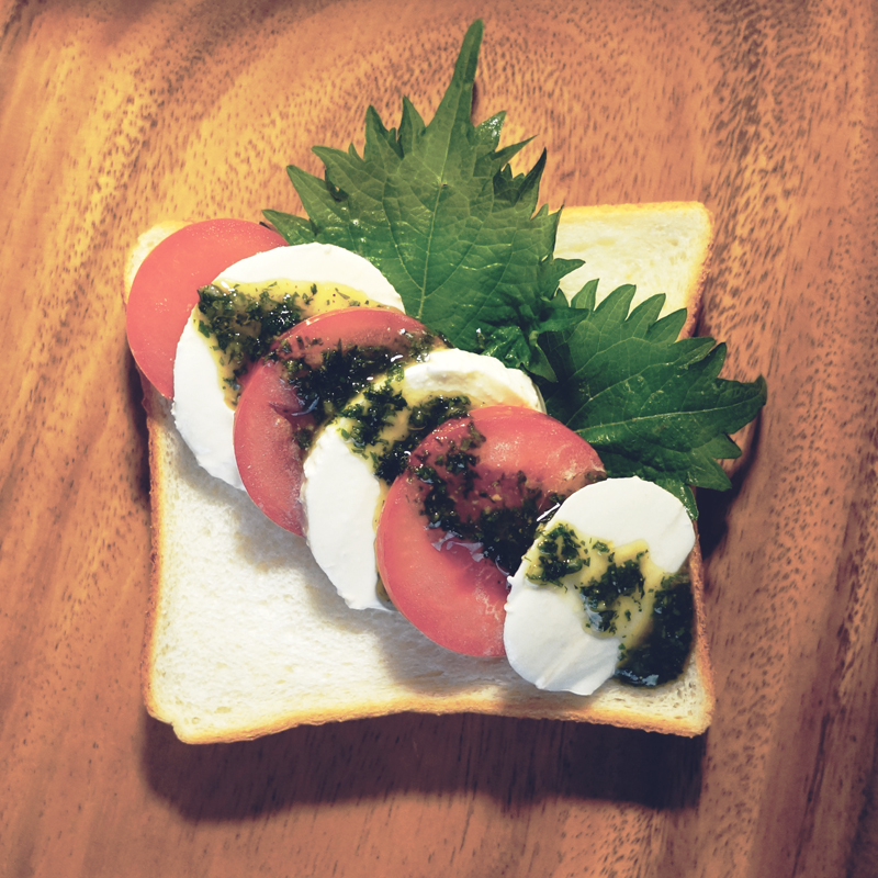 6. 食パンに彩りよく盛り付け、ジェノベーゼソースをかける