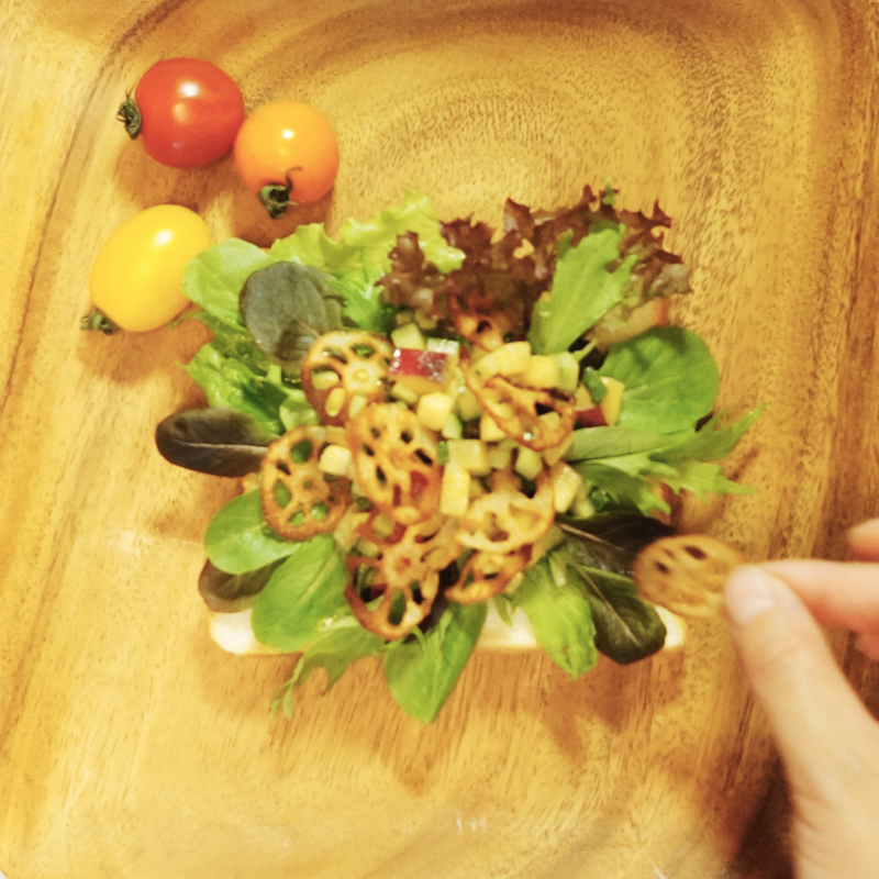 7. 食パンにベビーリーフしき、中心に6を盛り付け、揚げ焼きしたれんこんをトッピングする