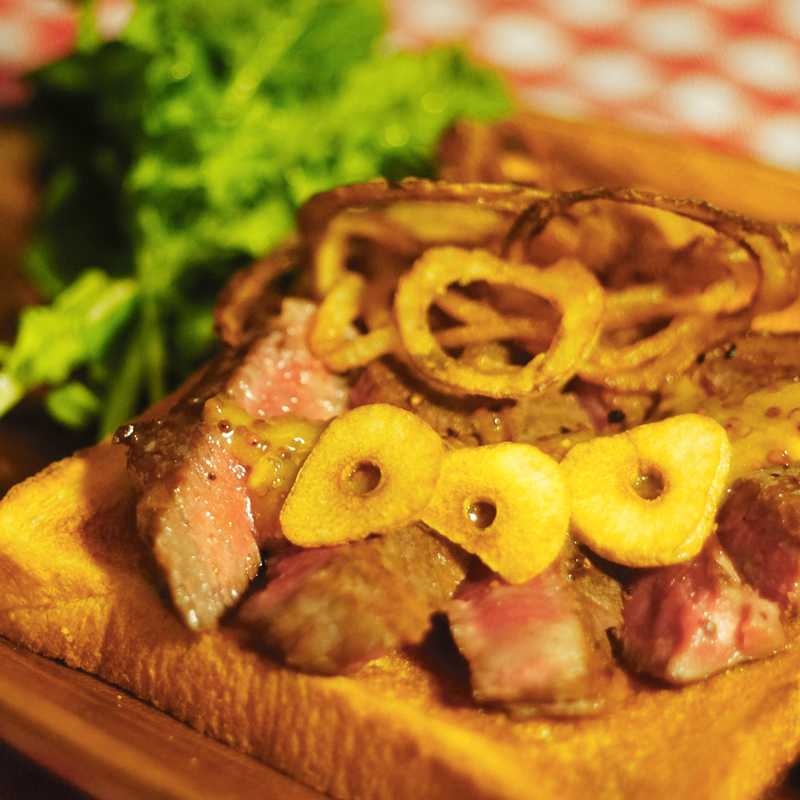 6. トーストした食パンにステーキ、オニオンフライ、にんにくチップをのせ、ピーナッツハニーマスタードクリームをかける